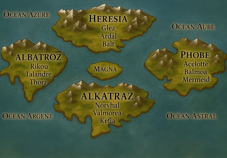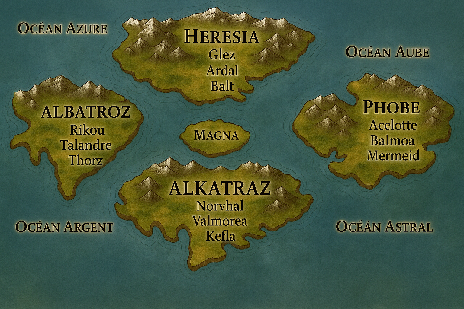 Cette carte a été créée par Aladine Binks, un voyageur issu d'une grande dynastie Alpha. Elle date d'environ 500 ans avant la naissance de Galion, soit en l'an 600. Cependant, elle n'est plus adaptée : d'après les scientifiques et les géologues, d'autres royaumes (mineurs) ont vu le jour depuis, et le grand continent de Magna n'est plus.